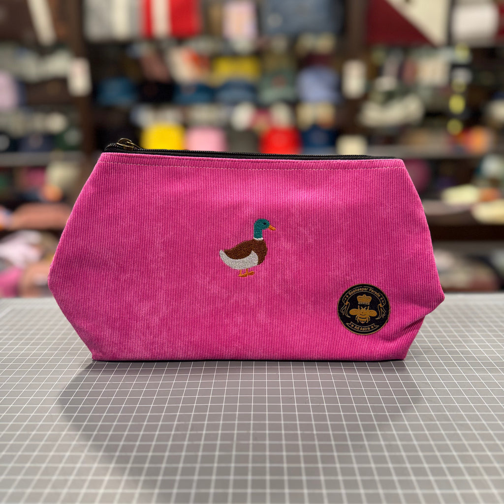 The Duck 🦆🪡 on Hot Pink Corduroy Large Toiletry + Makeup Bag